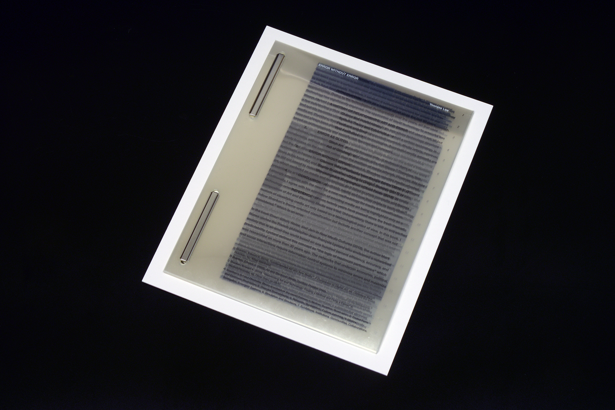 <Error without Error>는 기술적 에러와 예술의 관계를 탐구하는 이윤재의 석사 논문이다. 논문의 핵심 내용은 에러가 사실 인간이 요청한 것에 대한 기계의 정상적인 수행 결과 중 하나라는 것이다. 즉 기술적 오류라는 것은 사실 없고 인간이 기계가 생성한 결과를 분류하는 기준만 존재한다. 나는 이러한 관점을 책 디자인에 적용하여 글쓰기와 책 디자인에는 아무런 문제가 없지만 인간이 오류라고 인지할 법한 책을 만들어냈다. 투명한 필름에 인쇄된 이 책은 처음 마주했을 때 모든 텍스트가 겹쳐보여서 독자가 아무런 내용을 파악할 수 없다. 하지만 원한다면 여분의 시트를 페이지 뒤에 덧대는 방식으로 책을 읽을 수 있다. 다소 불편한 이 책의 독서 방법은 오류가 사실 오류가 아니라는 사실만큼 독자들을 의도적으로 당황스럽고 불편하게 한다.