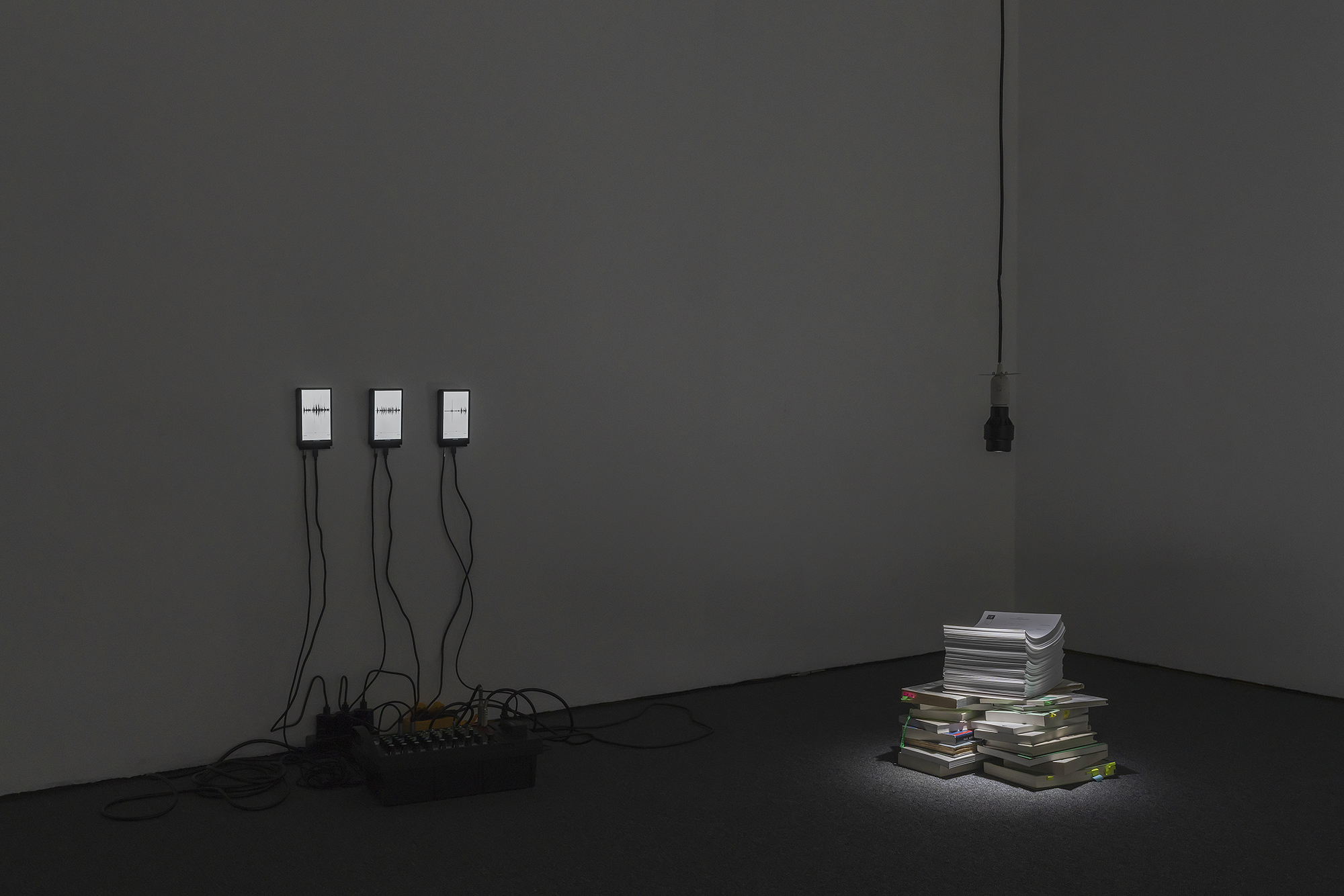 APIS (2025) begins with the full duration of the exhibition, thirty days or 43,200 minutes, which is then articulated into three mutually prime lengths 13, 47, and 71. Sounds associated with the human, the non-human, and artificial intelligence unfold simultaneously, remaining audible yet never aligning with one another. The artist converts Lysis by Plato, written in ancient Greek, into the format of a programming language through OCR4), and then translates it into an artificial voice. These processes are layered with the friction of paper, everyday noise, and the sounds of a snail feeding. A series of drawings accompanying the sound work, also titled APIS, renders this non-overlapping structure through hundreds of distinct triangular forms.